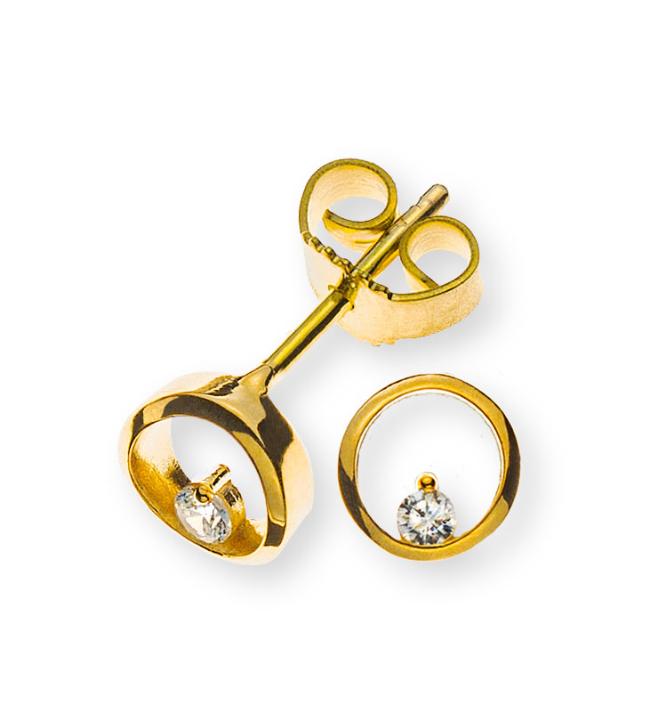 Chaque clou d'oreille est serti d'un zircon éclatant, situé sur le bord du cercle ouvert, offrant un contraste séduisant avec l'éclat de l'or jaune poli. Le cercle ouvert est un symbole d'infini et de continuité qui porte une signification profonde dans un design simple et élégant.